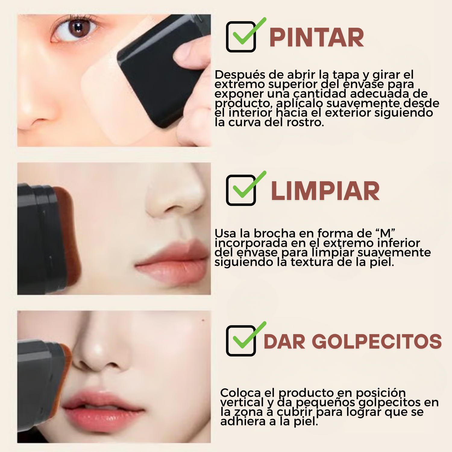 No necesitas brochas, ni rutinas largas: desliza, difumina y listo. Ideal para retoques rápidos y resultados profesionales.