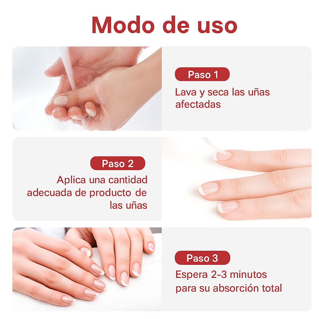 Lava la uña, aplica Fungi Nai y deja absorber 2-3 minutos para eliminar el hongo desde la raíz