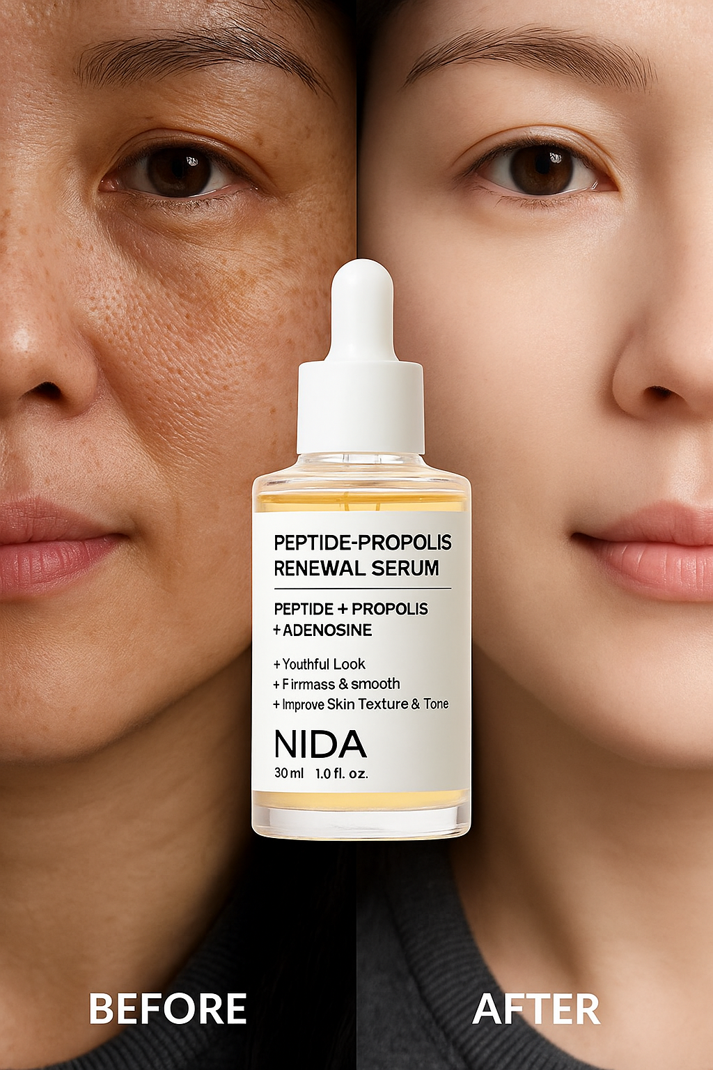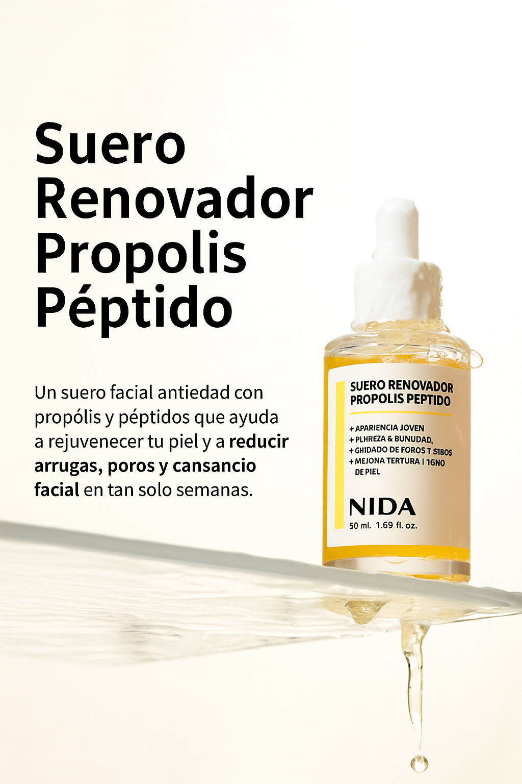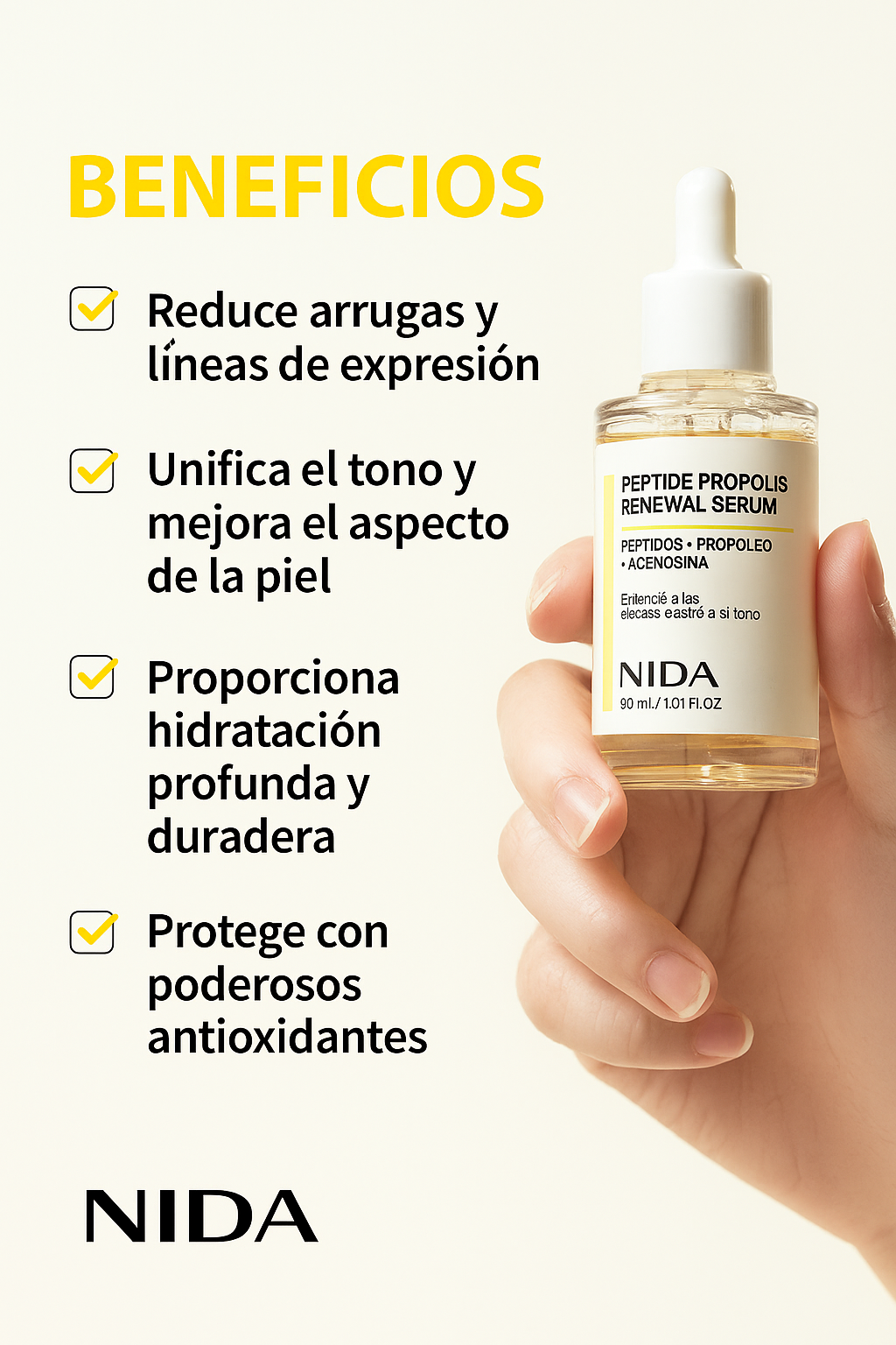 Redescubre el poder de una piel firme, limpia y luminosa con el serum antiedad NIDA. Su fórmula coreana con 6 péptidos, propóleo y adenosina trabaja día y noche para suavizar líneas de expresión, eliminar poros negros y reducir arrugas.