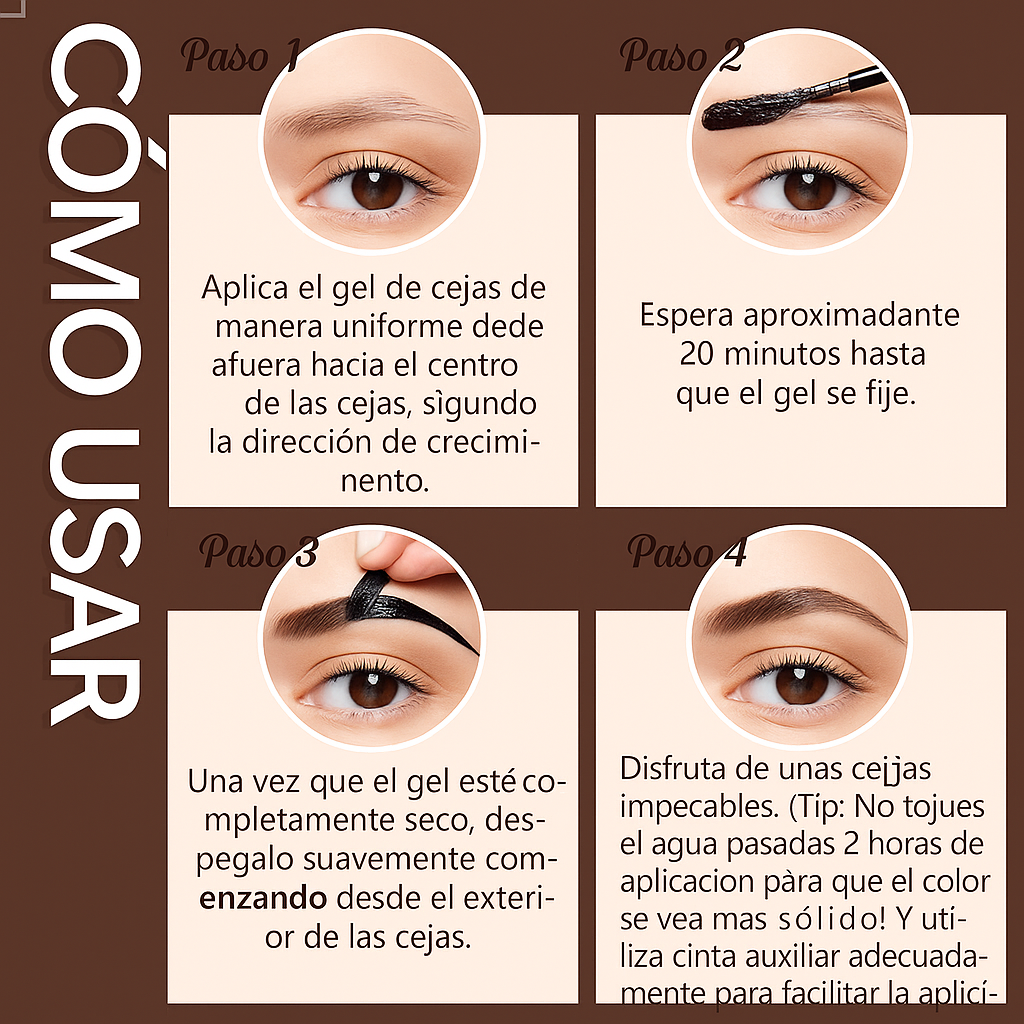 Modo de Uso: Aplica en tus cejas por 10-15 minutos y disfruta de hasta 3 días de duración