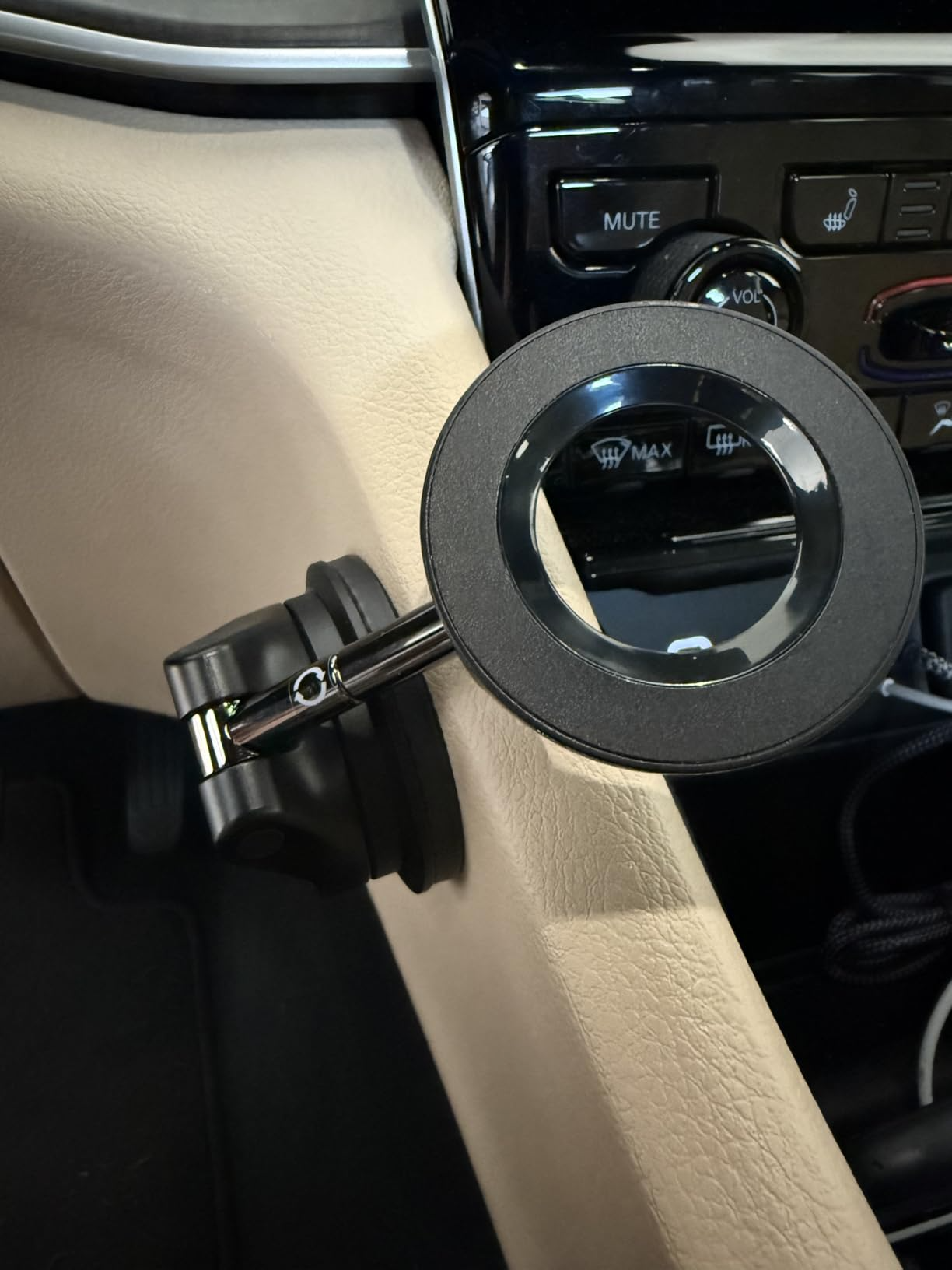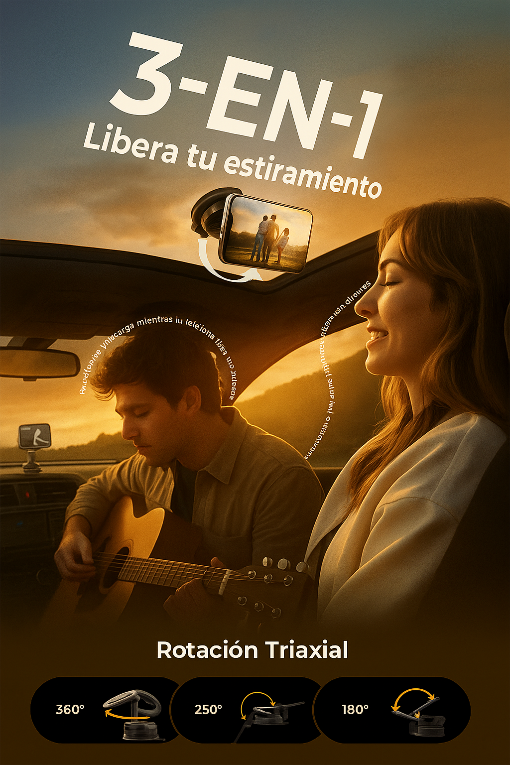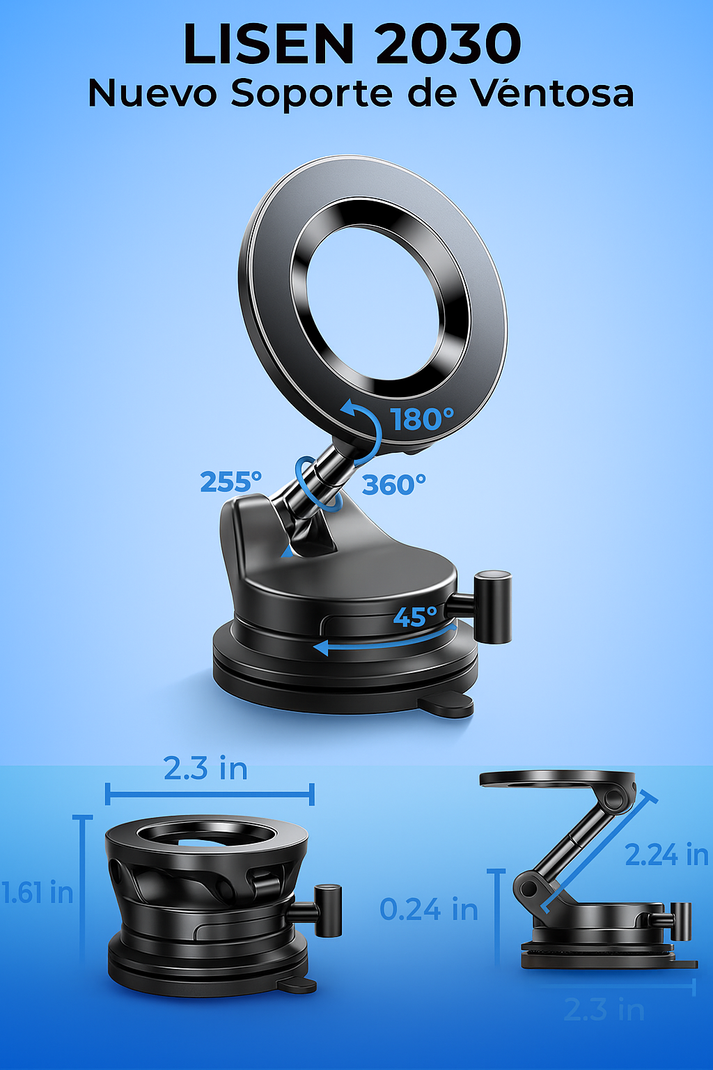 Diseño compacto, elegante y rotación 360°. Tu pantalla siempre visible sin taparte el camino.
